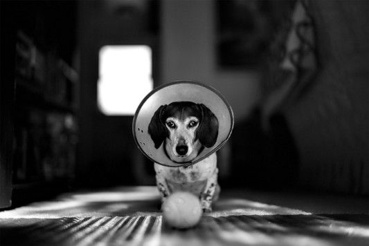 - the classic dog-in-a-cone rarely gets old ... at the same time, it is so rarely done with anything that is unique or at least somewhat refreshing. what makes this image stand out is its calmness ... the choice of black-and-white, the deep shadows, the minimal highlights ... and most of all, the steady stare of the dog. it is this steady stare which - i believe - speaks greater volumes than the usual maudlin looks one sees in so many images of dogs in cones. and of course, the added element of the ball, which we are left to believe this poor dog is unable to grasp within his cone, only adds to the 'story' quality of this image. wonderfully seen and executed. ~ illona
