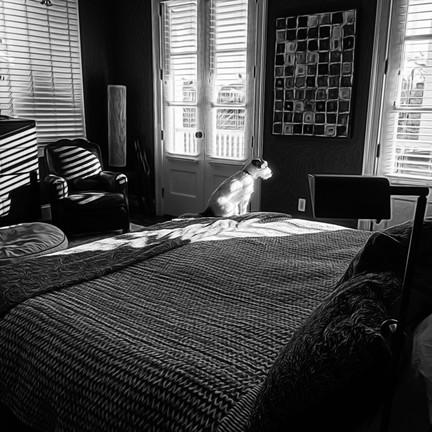 - Thank you very much for this honor and congratulations to all the winners here. You are correct, I did add a painterly effect to this image but I masked out my dog. This was a quick grab shot. Ozzie, my Russell Terrier, was mesmerized by anything that was moving outside. I shot this with my iPhone 6 and converted to B&W via Silver efxPro. I am Claudia Robinson in Charleston, South Carolina.