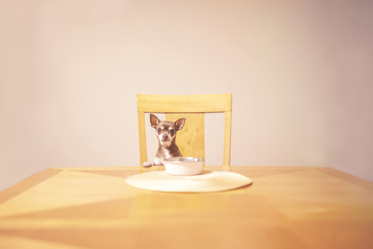 - i've certainly seen my share of photos of dogs at the table, but this one still has its own quiet presence within that crowd of images. the almost monochromatic, minimalist surroundings, and the sweet, calm little dog with the quiet but intense stare. nicely done. ~ illona
