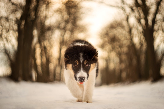 - the wonderful low angle with which this image is captured allows us to get a glimpse of that true collie intensity, even in a puppy. beautiful depth of field to highlight the subject, framed wonderfully with the almost sweeping trees, and lovely post work. nicely done. ~ illona