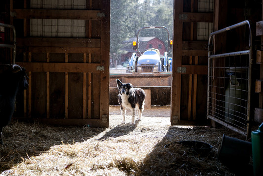 - the light in this image is almost perfect -- the depth of shadows inside the barn and that glorious, wide shaft of light flowing in around the dog, catching the dust motes (or early snow flakes?) around him. i'm sure i'm not the only one wishing that big blue tractor hadn't been parked there ... but with animal photography, unlike people photos, there are rarely do-overs, and asking this lovely senior collie to wait while someone moved the tractor obviously is not an option. however, in cases like this, when a killer shot can be the result, i've been known to take the shot, THEN ask to move the tractor, reshoot without the dog and tractor, and fix in post. just a suggestion for future shooting; with the strong framing and separation of planes in this image, it would be relatively easy to accomplish. still, wonderfully seen and captured. ~ illona
