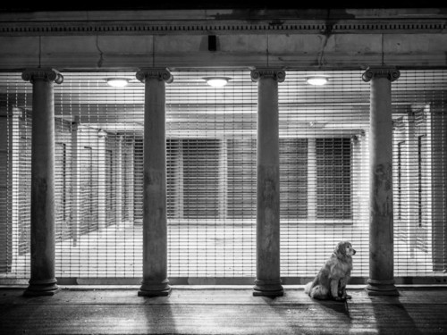 - i commend this photographer for seeing the possibilities in what was probably a rather drab setting ... there is not a lot of magic in the light of this image or setting, but the lines and the starkness work to allow the subject to stand out in a scene where we might not typically expect to find a dog. nicely seen and executed. ~ illona
