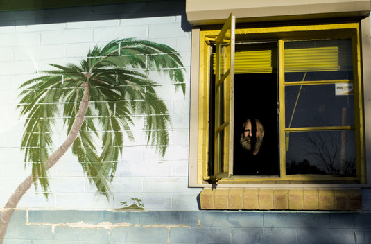 - Colorful and rich with potential, we found this image engaging. The blue and yellow juxtapose each other just as the palm tree's and the man in the dark shirt in dark room. We are intrigued. Does the bearded man in the dark room wish he were on the tropical island, or did he come to the city to find his dream and fail?