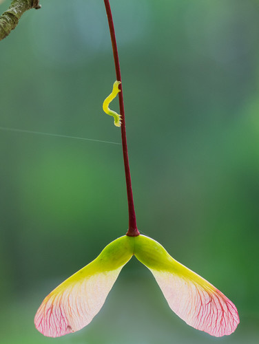 - This spring photo was taken at the edge of the woods next to our home. I often cruise around the perimeter of our yard, camera in hand, looking for nature and macro shots. In this case I was holding an Olympus E-M1 with a Olympus 50mm F2.0 macro lens. Actually, I was at first focused on the Maple seed pods which are so beautiful dangling from the trees especially when slightly back lit as seen here. My eyes widened excitedly when I saw this inchworm working its way up the stem. This was taken at just the right moment (with tongue in cheek, I would call it the peak of action) and the angle was just right to pick up some highlights on his silk thread off to the left. F4, 1/160 sec, ISO 200.