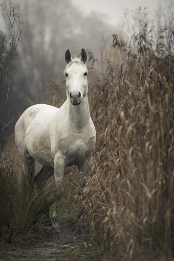 - what an absolutely beautiful photo. the subtle tones and foggy atmosphere, accentuated by the shallow depth of field, the alert focus of the horse, and the wonderful variety of textures -- from the tall dried grasses to the muddy path, the green grasses, the white horse, and the foggy background -- all present us with a strong and compelling image. very nicely done. congratulations! ~ illona