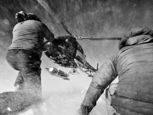- A Guides Eye View Two mountain guides direct a helicopter into land high in the Swiss Alps. I took this shot whilst shooting an extreme ski and snowboard competition - the Nendaz Freeride FWQ. I had been dropped just before on the peak and with the permission of the guides cowered down behind them to capture this shot when the remaining supplies were delivered. My lens took a bit of a battering and I could only hold myself in position properly for a few seconds as the rush of snow debris was insane at this point. Taken with a Nikon D7000 with Tokina 11-16 f/2.8 lens at 16mm, 1/2000sec, f/4.5, ISO100