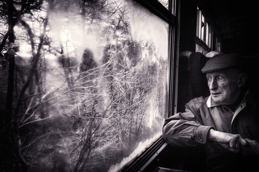 - Made with Leica Monochrom and 35mm Summicron on a journey on a heritage railway trip. I sat at a seat in a compartment where the windows had steamed up hoping this would make a more interesting image. I just needed somebody with an interesting face to come and sit opposite, which is what happened. I noticed the old gentleman had lost the fingers on both hands and with his sad look and threatening branches couldn't help but wonder what he had endured in life. We didn't speak but smiled in acknowledgement of a nice trip, but I dont think he knew I had made a photograph so deep in thought was he.
