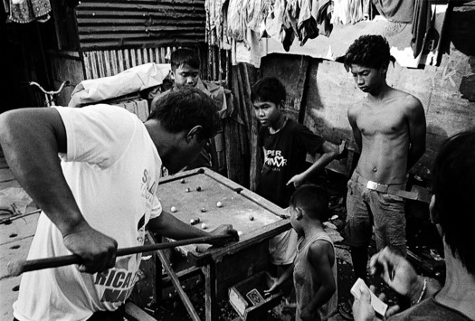 - My name is Adam Bennett and I'm a British street and documentary photographer currently based in Seoul, South Korea. This image is part of an upcoming project titled 'Tacloban : After The Storm' due to be released on 15th April. It was shot in February 2015 in Tacloban, Philippines. The image captures a small part of community life in Anibong, one of the areas worst affected by Typhoon Yolanda. People gathered around to watch as a man and boy played a game of pool in the narrow passageway between their homes. It was shot on Kodak TRI-X400 using a Minolta CLE and Zeiss ZM 28mm Lens. Home developed using D76.