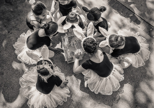 - The annual Blessing of the Animals in Los Angeles is always one of spectacle. Animals of all shapes and sizes arrive to be blessed. As I wandered through the crowds I happened upon these little ballerinas who were totally captivated by a bird in a cage. The girls were a flurry of activity trying to see and talk to the bird. I shot several frames, but this one where I held the camera over my head and shot down, was the winner for me. Captured with a Canon 5D MarkIII : 24mm : f/8 : ISO 125 : 1/125 second and processed in Lightroom. I am honored to have received a "Mark of Excellence." Thank you!