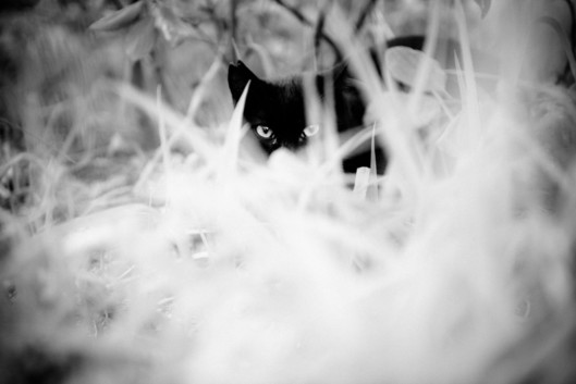 - this wonderful capture stands out because of its shallow depth of field and the focus successfully planted on the black cat crouching in the grasses. the choice to convert this to black and white allows the subject to stand out even more. of course, given the cat's firm focus on the camera, i have to wonder about these eyes, and suspect that the image would be just as successful in color. nicely done. ~ illona