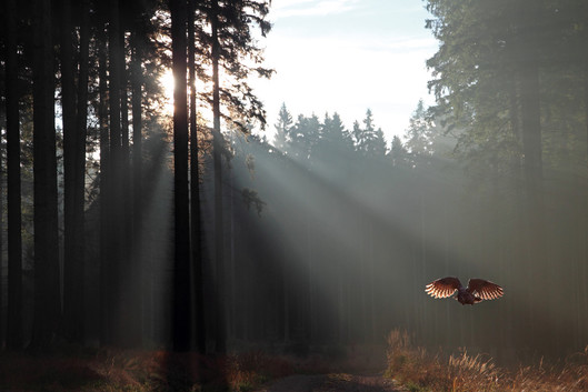 - An evocative backlit study with the sun and owl balancing the arrangement and the trees providing a strong sense of place.