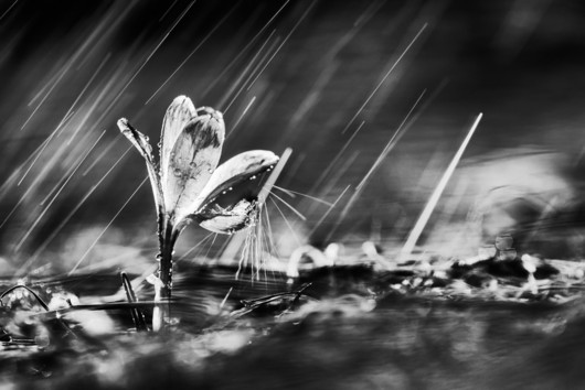 - Sometimes we get a black and white submission, which is fantastic. This photo has got it all. It seems to be raining hard and the flower is clear and strong. Well seen and executed.