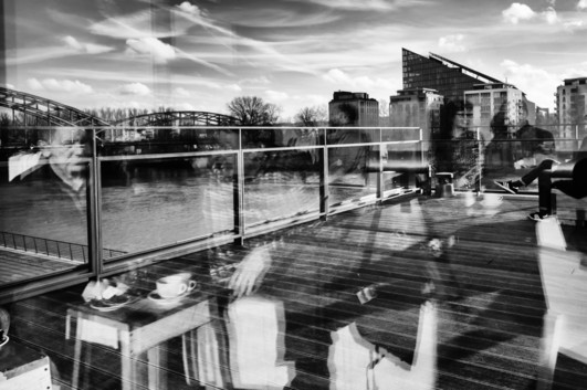 - I feel very much honored – many thanks to the jury. The image was taken in Frankfurt, very close to the new European Central Bank at the Main river. It was mid January and the first day with sun and blue sky crossed by condense stripes of planes - people were longing for the first sunshine. My husband and me were sitting inside the coffee restaurant while waiting for a coffee and saw the empty balcony where people usually sit in summertime outside – but it was still much too cold. I took the picture seeing people sitting inside, but pretending sitting outside due to the mirror glass. The picture was taken with my Leica M9 and Elmar 24mm/f 3,8, processed with LR 5 and SE. My name is Sam Soon Hanke, based in Frankfurt.