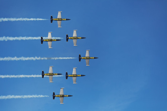 - Thank you for the votes. This photo of the Breitling team was shot during an air show in Toulouse with a Canon 5d mark2 and a Canon 70-300 zoom at 300mm.