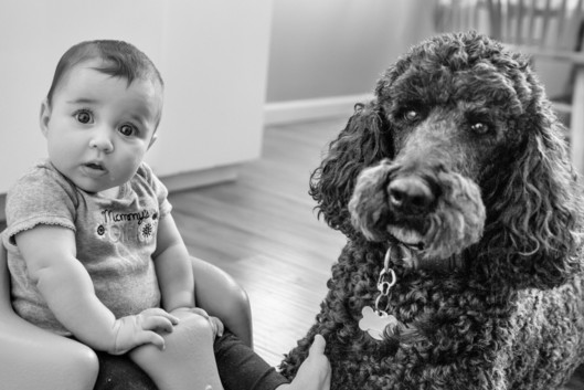- What a lovely shot! I like their facial expression! It looks like the dog takes care of this little baby. Both are attentive and look in a curious way to the photographer.