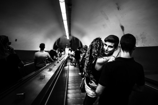 - Thanks for awarding my photo Mark of Excellence. I am very honored to have been selected. My name is Davide Granata, from Rome (Italy). My passion for photography is more then 10 years old. This photo was taken in Rome, during the descent of the escalators subway; Summer 2015. Camera used is a new Leica Q, 28mm f1.7, @400iso and 1/200sec. Post processing with Lightroom and Photoshop, personal color profile and brushes of mine. This shot was really exciting in the simplicity of a teenage love; the spontaneity of a hug translates into the smile of the boy. He has an hypnotic gaze and immobilizes you; What do that look and smile say to you?