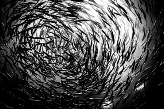 - Well however you managed this… It is not everybody’s comfort zone being in the middle of a spiralling shoal of fish. The surface light really sets the fish apart into a mass of swirling silhouettes. It is pretty spooky really and makes me dizzy. Clever shot, well done.