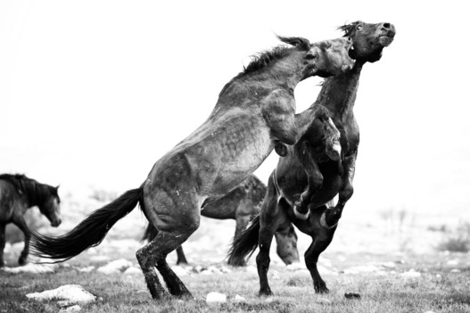 - what a perfect action capture, and the black-and-white conversion, as well as the starkness of the landscape, allows the subjects to truly stand out. the timing is impeccable -- the open mouth of the one stallion and the rolled eye of the second. wonderfully captured and handled in in post. ~ illona