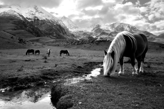 - what a fantastic landscape and horse image. the stream opening up from the lower left frame and reaching back into the frame of the image, leading our eye to the pony in the foreground ... while the leading line of the mountain tops takes us to the same subject. wonderfully seen and captured. ~ illona