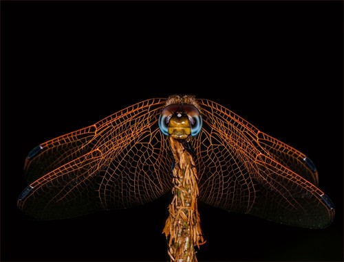 - This is an original macro! The framing is well think you have done well to focus the dragonfly. The texture of the wings is beautifully rendered, the light flash is well managed. The black background really brings out the subject. A very beautiful image.