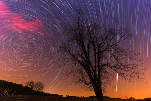 - Wow ! This is an original silhouette shot against a frantic night sky. I like your composition with plenty space for the tree and the northern star circle, and use of the very wide angle which has helped you create those amazing star tracks. Great work, well done!
