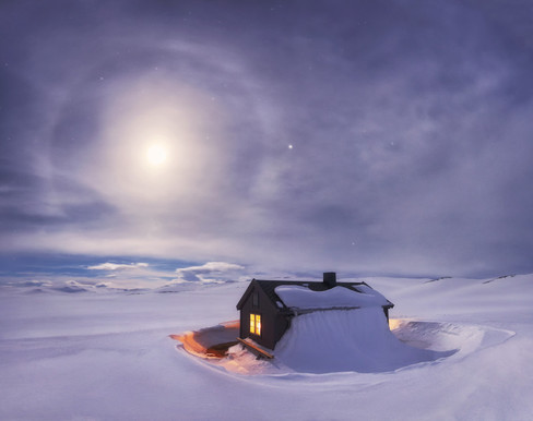 - This is a lovely moonlit night shot. The halo around the moon setting off the hollow around the house. Nicely exposed light in the window to add that warmth.