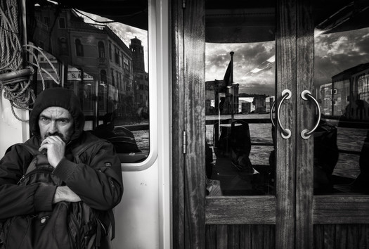 - Captivating photograph; intense face expression on a ship, with the city reflecting in the windows. We find that our thoughts are reflected between his thoughts and the city.