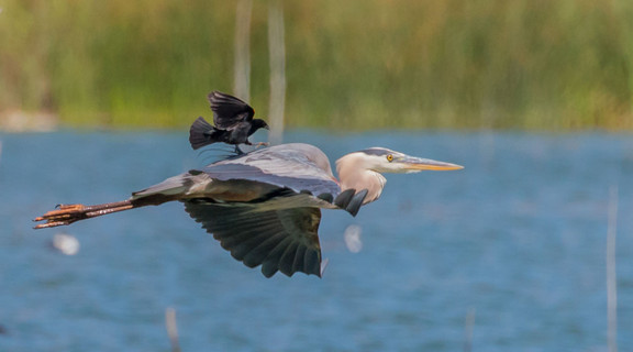 - An unusual moment captured at eye level as this blackbird mobs - or apparently rides on - this heron's back.