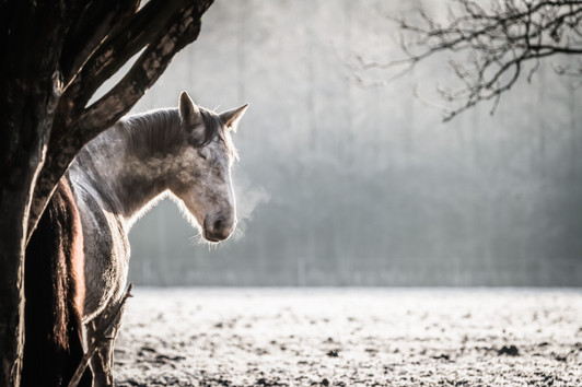 - What a beautiful image. The framing of the tree trunk on the left and the branches reaching in on the right keep the viewer's eye in frame and directly on our subject. The detail of the breath vapor and low sun catching the fuzz of the horse's winter coat add to the feeling of the cold morning. Wonderfully done! ~ illona