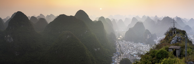 - For many, the shapes of these little mountains will be quite unfamiliar and astonishing and that creates appeal. The choice of the panoramic format was a good one to present those shapes and the city nestled at the base. The backlighting and capture with the mist (or smog?) helps amplify the aerial perspective which helps convey the sense of space. Nicely done!