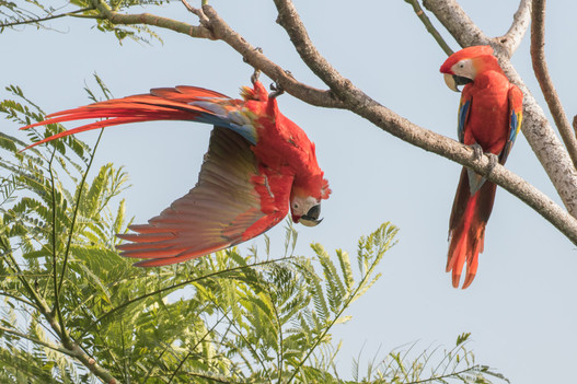 - This image captures the impressive acrobatics of the macaw, but is also humorous as the right-hand bird seems to be bemused by the other's antics.