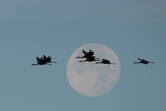 - A nicely spread flock of cranes outlined perfectly against the moon.