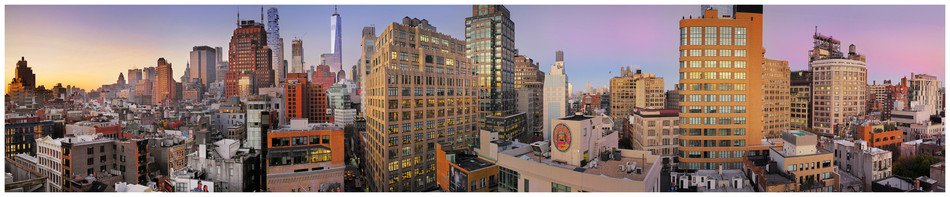 - M240 35mm, multiple images stitched together. Taken from the roof top of the much recommended 60 SoHo Hotel in NYC. Really nice staff, let me use the roof although it was closed, it helped that the Ukrainian concierge was a photo buff himself. The images were taken at sunrise, which explains the color variation across the sky and the buildings. The intent here was to render an image that conveys a sense of Babylon, a city that extends as far as the eye can see with color variation guiding the eye through the cityscape. For more on my photography, images and musings on the subject go to: