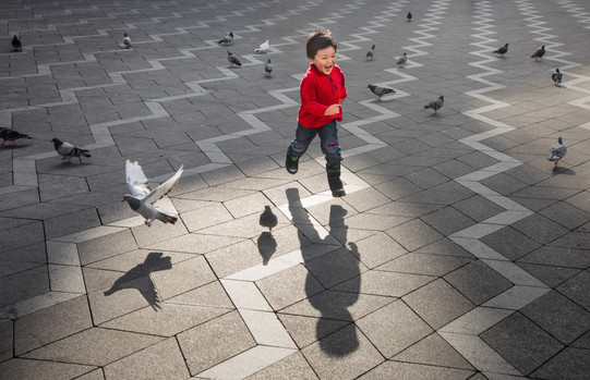 - All young boys love to chase pigeons. This photo adds interest by capturing the boy in mid air - detached from his shadow. Well done!