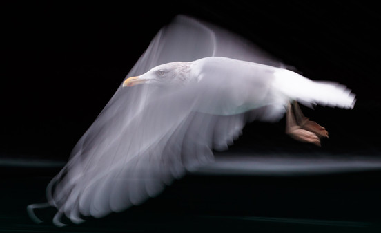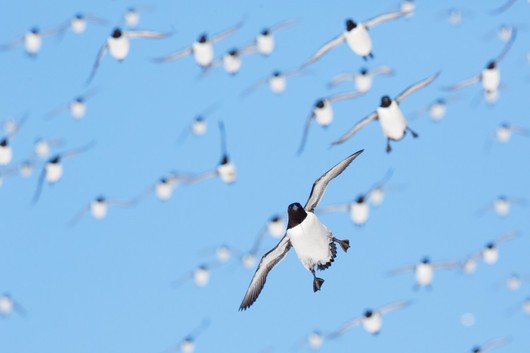 - In any type of wildlife photography, if you can convey the spectacle of a species en masse, this can be much more powerful than depicting a single individual. Such mass shots, though, can be challenging for two reasons: first, showing many individuals normally means you don't see any real detail in any of the individuals; second, large group shots don't normally have a focal point to capture the attention. In this shot, though, the incoming flock of Auks has been framed with the closest bird showing detail and providing a focal point. The differential focus of the more distant birds adds a sense of depth to the scene. This is a great example of how the power of a flock can be harnessed to create an image with real impact.