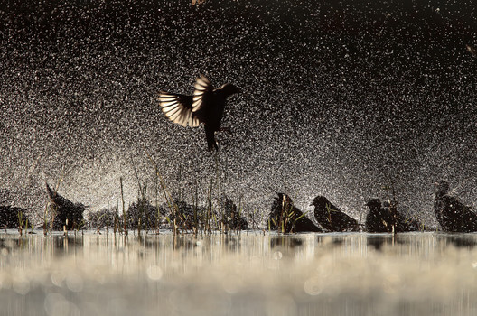 - Surreal backlit view of starlings bathing, with the incoming bird providing a focal point against the multitude of droplets.