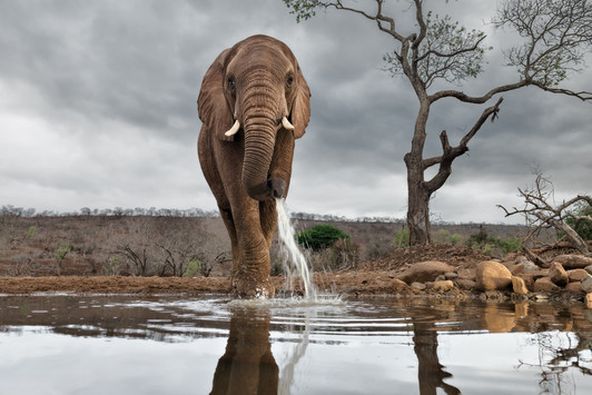 - The shot was taken in South Africa, during the dry season, in 2016. An elephant came to a puddle to drink and play with water. Nikon D800E with Nikon 24-70 f2.8.