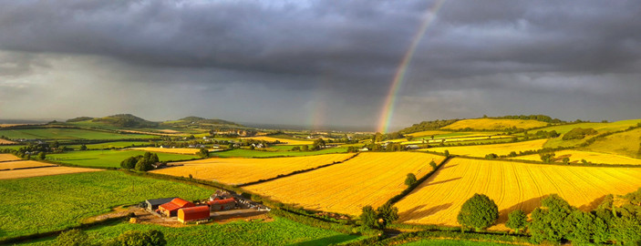 - The strong light of a stormy sunny spell makes the colours really pop, softer peripheral light makes the scene so comfortable to admire. The hedgerows divide your picture up and help bring out those tractor lines. You have framed this well with the rainbow and farm buildings helping my eye back and forth. Lovely countryside too, beautiful work, well done.