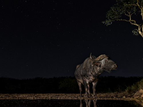 - The image was shot in South Africa. Close to a waterhole a hide allows to take pictures without disturbing animals that come to the puddle to drink. During the night two low intensity led panels light the scene (continuous light doesn't disturb animals like flashes can do). To take this picture I waited for the buffalo, lighted off the leds, and during a 10 second long exposure I manually swhitched on and off the lights for a short time. The camera I used was a Nikon D800E with a Nikon 24-70mm f2.8 lens at f5, ISO 1250.