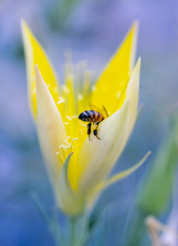- This photo actually puts a smile on my face, while judging this flower competition. Very funny, how only ’the other half’ of this bee is visible. The depth of field here is well chosen, and the yellow of this flower really makes that bee stand out.