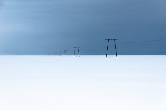 - Here is a strong image which has only 3 ingredients: white, grey and a few powerful strokes of black. The vast expanse of flat snow covered space is put into scale by the endless line of pylons. Your composition is precise and minimal, it is beautiful and hard and bleak, the two contrasting symmetrical halves collide and draw a strong and compelling horizon. The pylons are exactly where they must be… Great shots can look so easy but that is far from the truth. Very well done, you are the winner and in a class of your own this round.