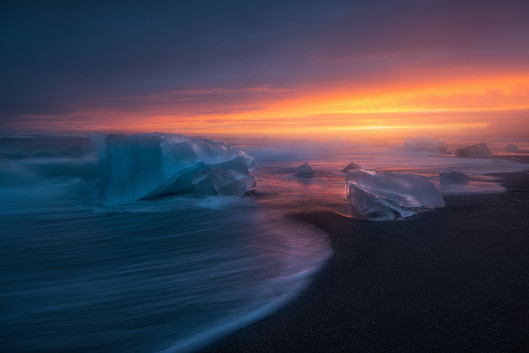 - Beautiful ice blocks like the diamonds in the sun sparkle on the black beach Breiðamerkursandur in Iceland and transform it into a glowing field of ice. The whole beach is covered with chunks of ice which brings up a really mysterious atmosphere. I was able to witness this miracle when deep red turned into bright orange while the glowing ice blocks were torn around by the sea. Absolutely gorgeous spectacle worth to see and experience. Nikon D800 + 14-24mm; f/11, 0.8s, ISO 200 Post processing - Exposure correction, colour and contrast adjustments.