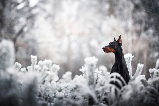 - This is such a fabulous and stunning image ... the contrast between this handsome doberman and the cold, stark winter landscape is perfect, and the beautiful lines of this magnificent dog are able to stand out. Wonderfully captured and managed in post. ~ illona
