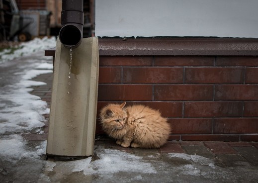 - This street photo offers not just wonderful tones but also a variety of textures -- from the warm-toned brick, to the cold ice and slush, the captured water droplets from the metal pipe, and finally to the sweet, longhaired orange kitten. Wonderfully handled in post. I sure hope this kitten is now warm and loved. :) ~ illona