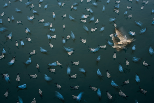 - Clever use of a double exposure with different settings to show motion. It's easy to spend quite some time pairing up the gulls and pondering on their movements.