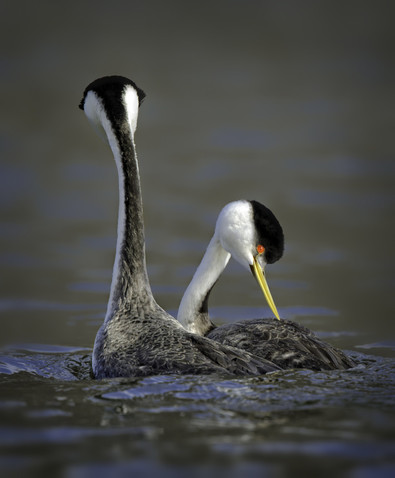 - My name is Anita Ross. I took these two Western grebes at Lake Hodges in Escondido, California. After years of the lake being low because of a lack of rain, last year for the first time in seven years the grebes found the conditions just right for bringing little grebes into the world. I'm hoping they will have chicks again this year. I was using my Canon 5D mark IV camera with a 2X extender on my 400 DO II lens.