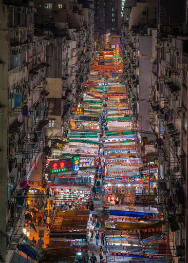 - The soft tones combined with the stable triangle shaped color section at the center of this image impart a soothing quality. When you stare at this image and let your eyes relax it can change perspective suddenly as if you were looking up instead of out. The repetition of shape between the buildings and the stalls in the night market also help this image. Very nice!