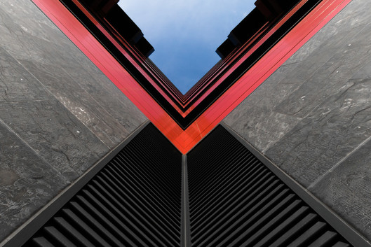 - Thank you! This is a photo of a modern building in my town, Vitoria-Gasteiz in Spain, taken from ground level up, in which there are red lines formed by the facades of the different floors and we can see some terraces in the form of black cubes, too. My name is Joseba Iriarte, and I took it using a Canon 80D camera with an Irix 11mm lens.