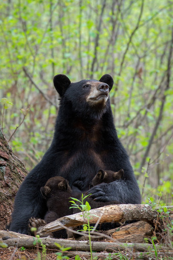 - Lovely black bear mother feeding her twins and a very wild forest view. The low angle through the plants and wood make this extra wild. Well done indeed.