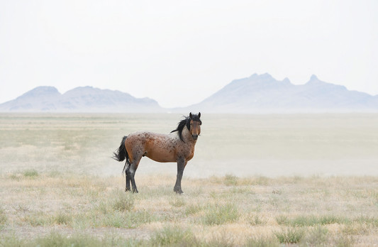 - This is an absolutely stunning image. The separation of this horse from the landscape is perfect ... the soft backdrop and the rich tones and shadows of the horse with his windblown mane and tail. The hazy landscape and the stirred up dust makes the viewer imagine the rest of the mustang herd running ahead of him, while this stallion pauses to look at the photographer. Beautifully captured and managed in post! ~ illona